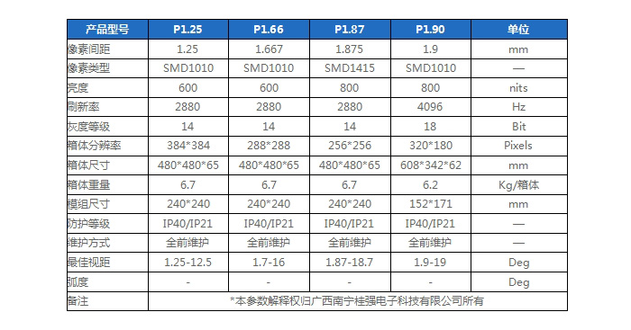 產(chǎn)品型號 | P1.25 | P1.66 | P1.87 | P1.90 | 單位 |